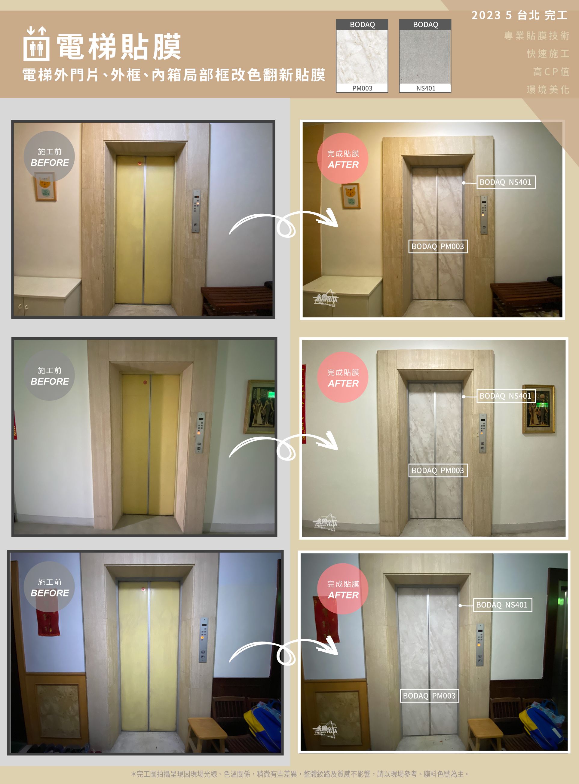 繪新貼膜|電梯貼膜|敦和大厦|電梯外門片、外框、內箱局部框改色翻新貼膜|BODAQ PM003 NS401